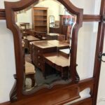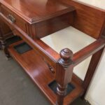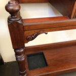 High quality solid Walnut English made Hallstand with original hooks, shield-shaped mirror, 2 shelves, glove drawer, turned legs, finials, carved and reeded detailing, lower tier and drip trays. Sturdy frame. Repolished condition.